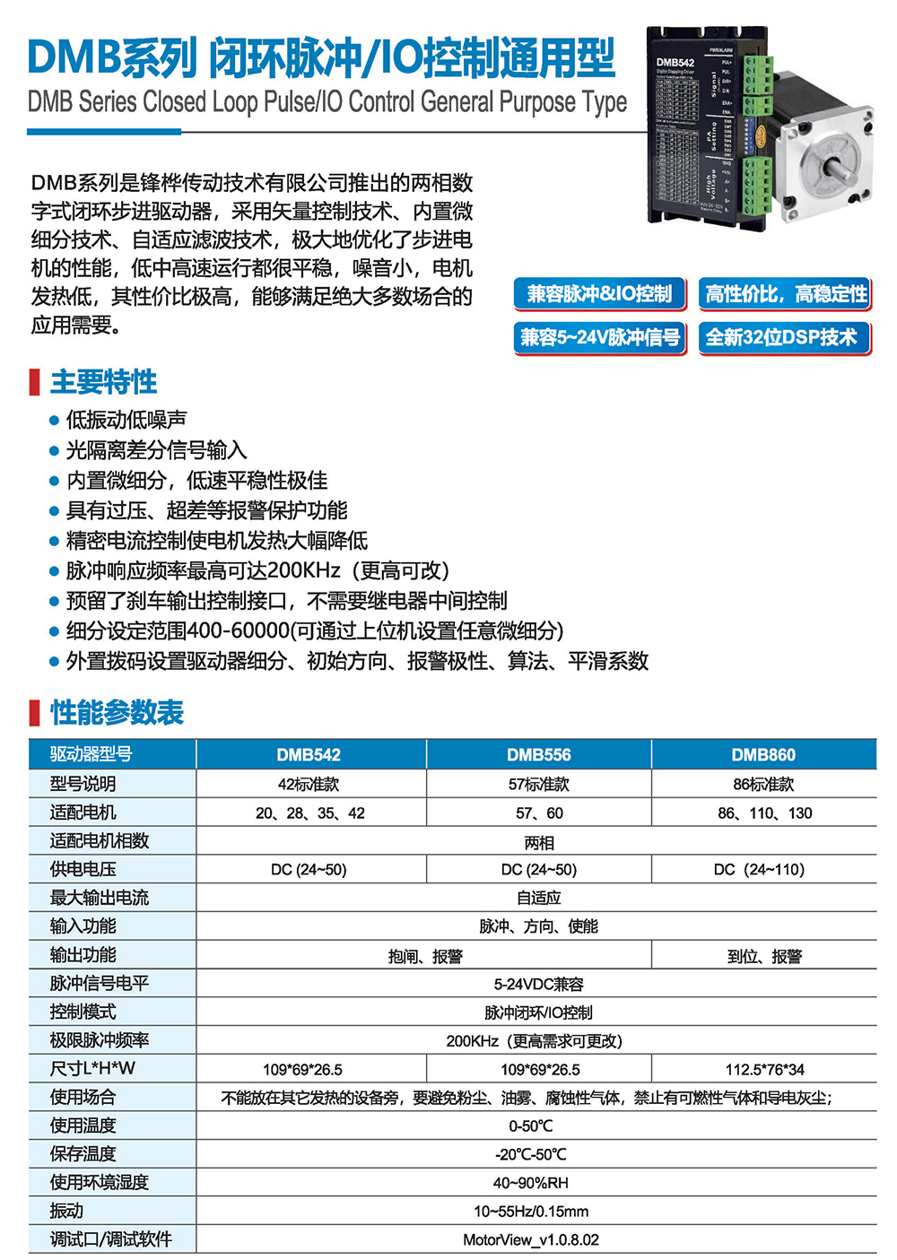 DMB系列是鋒樺傳動(dòng)技術(shù)有限公司推出的兩相數(shù)字式閉環(huán)步進(jìn)驅(qū)動(dòng)器,采用矢量控制技術(shù)、內(nèi)置微細(xì)分技術(shù)、自適應(yīng)濾波技術(shù),極大地優(yōu)化了步進(jìn)電機(jī)的性能,低中高速運(yùn)行都很平穩(wěn),噪音小,電機(jī)發(fā)熱低,其性價(jià)比極高,能夠滿足絕大多數(shù)場(chǎng)合的應(yīng)用需要。