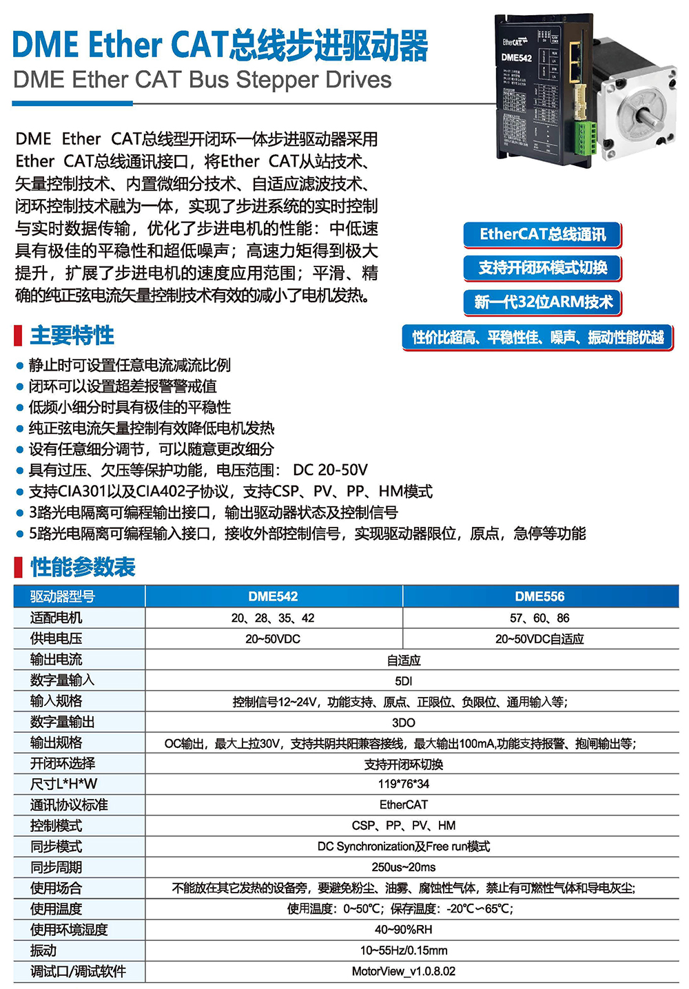 DME Ether CAT總線型開閉環(huán)- -體步進(jìn)驅(qū)動(dòng)器采用Ether CAT總線通訊接口,將Ether CAT從站技術(shù)、矢量控制技術(shù)、內(nèi)置微細(xì)分技術(shù)、自適應(yīng)濾波技術(shù)、閉環(huán)控制技術(shù)融為一-體, 實(shí)現(xiàn)了步進(jìn)系統(tǒng)的實(shí)時(shí)控制與實(shí)時(shí)數(shù)據(jù)傳輸,優(yōu)化了步進(jìn)電機(jī)的性能:中低速具有極佳的平穩(wěn)性和超低噪聲;高速力矩得到極大提升,擴(kuò)展了步進(jìn)電機(jī)的速度應(yīng)用范圍;平滑、精確的純正弦電流矢量控制技術(shù)有效的減小了電機(jī)發(fā)熱。