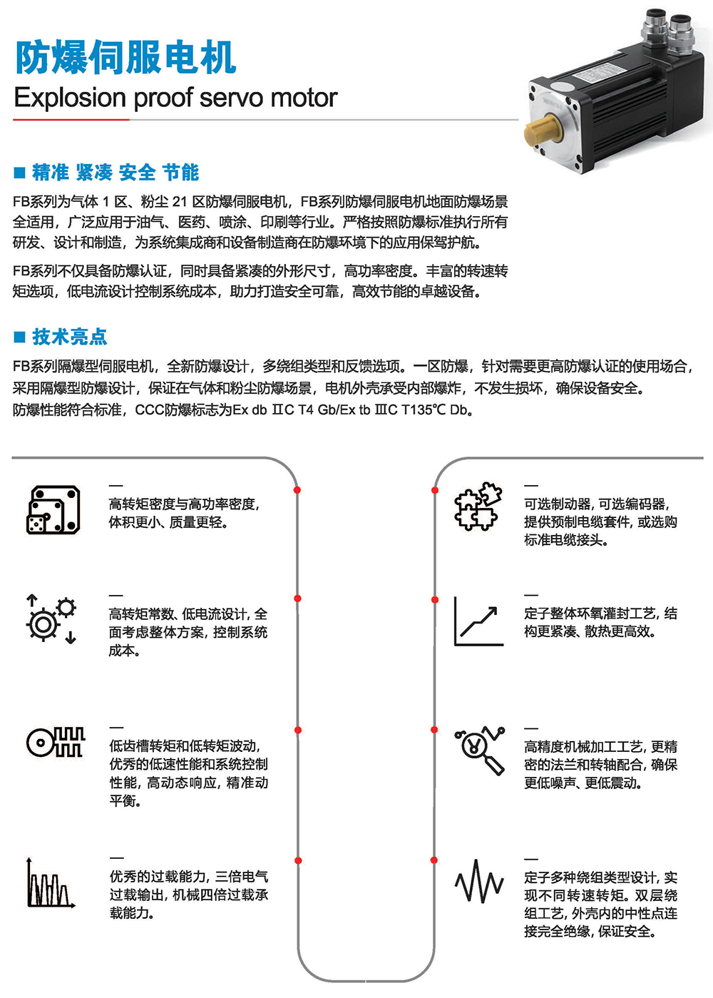 FB系列為氣體1區(qū)、粉塵21 區(qū)防爆同服電機(jī),F(xiàn)B系列防同服電機(jī)地面防爆場景全適用,廣泛應(yīng)用于油氣、醫(yī)藥、噴涂、印刷等行業(yè)。嚴(yán)格按照防爆標(biāo)準(zhǔn)執(zhí)行所有研發(fā)、設(shè)計(jì)和制造,為系統(tǒng)集成商和設(shè)備制造商在防爆環(huán)境下的應(yīng)用保駕護(hù)航。FB系列不僅具備防爆認(rèn)證,同時(shí)具備緊湊的外形尺寸,高功率密度。豐富的轉(zhuǎn)速轉(zhuǎn)矩選項(xiàng),低電流設(shè)計(jì)控制系統(tǒng)成本,助力打造安全可靠,高效節(jié)能的卓越設(shè)備。