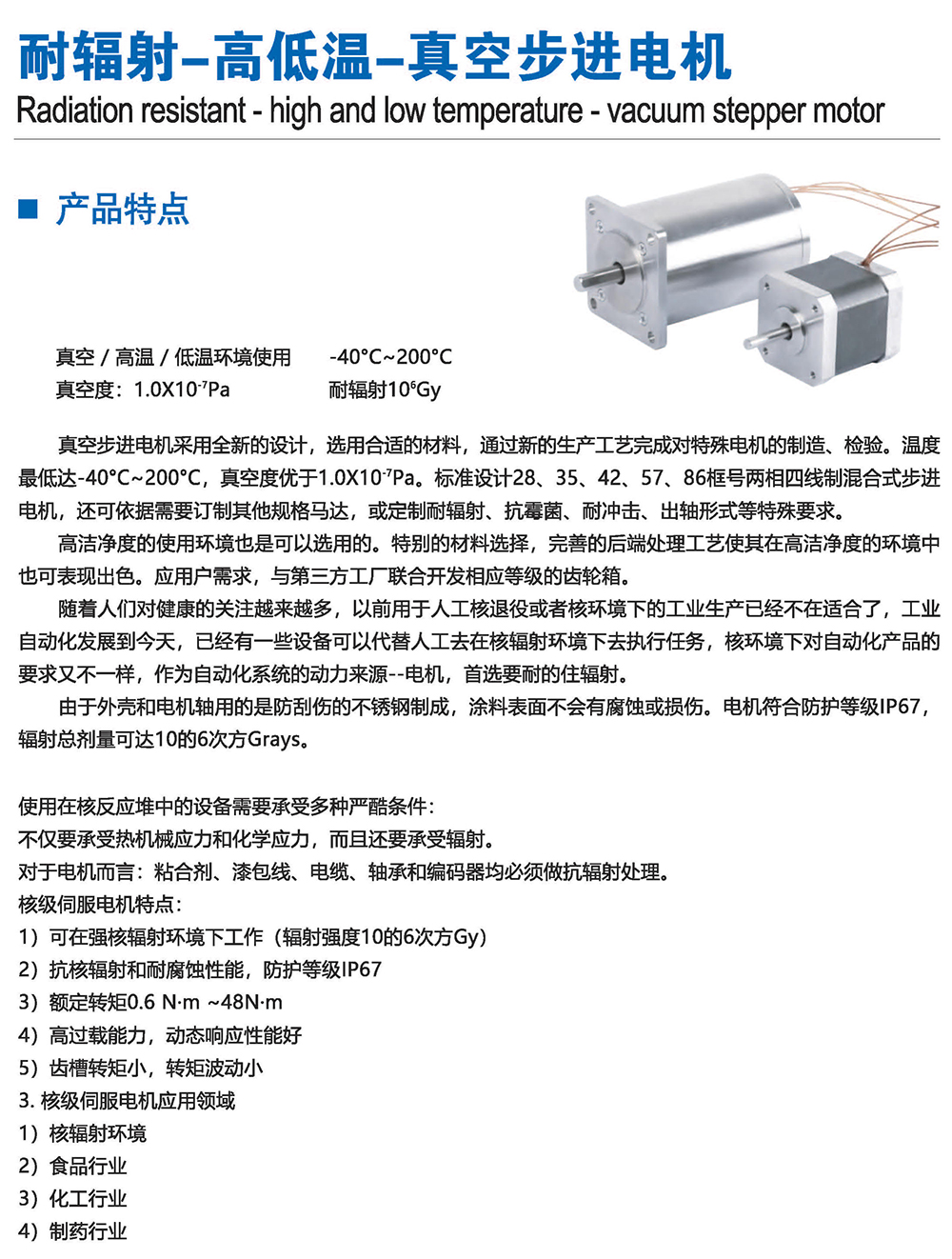 使用在核反應(yīng)堆中的設(shè)備需要承受多種嚴(yán)酷條件:不僅要承受熱機(jī)械應(yīng)力和化學(xué)應(yīng)力,而且還要承受輻射。對(duì)于電機(jī)而言:粘合劑、漆包線、電纜、軸承和編碼器均必須做抗輻射處理。