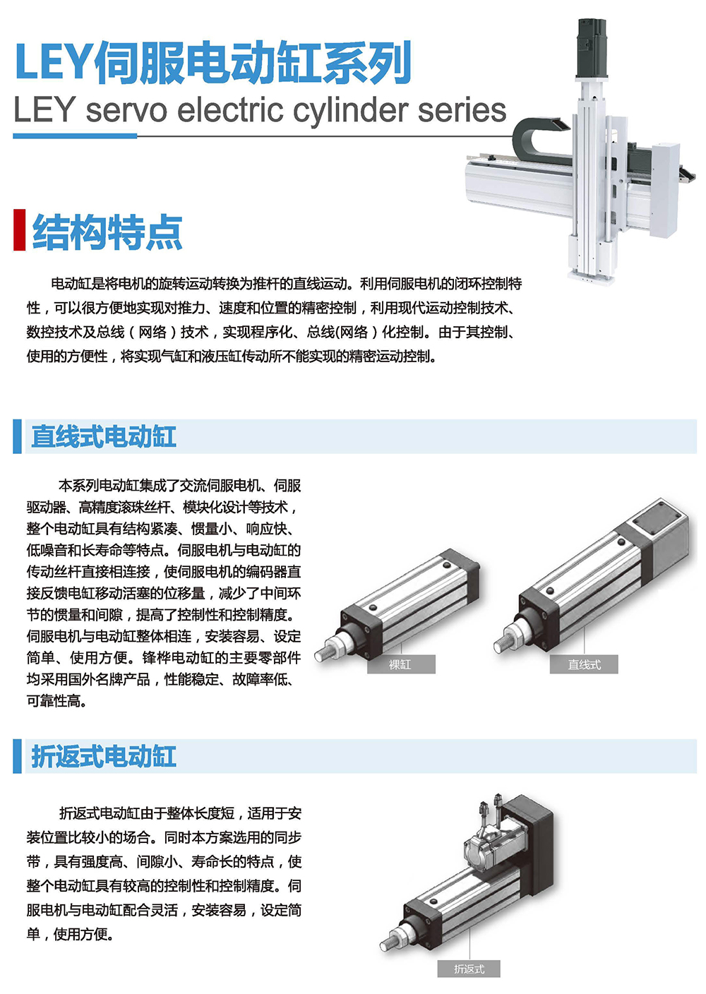 本系列電動(dòng)缸集成了交流伺服電機(jī)、伺服驅(qū)動(dòng)器、高精度滾珠絲桿、模塊化設(shè)計(jì)等技術(shù),整個(gè)電動(dòng)缸具有結(jié)構(gòu)緊湊、慣量小、響應(yīng)快、低噪音和長壽命等特點(diǎn)。伺服電機(jī)與電動(dòng)缸的傳動(dòng)絲桿直接相連接,使伺服電機(jī)的編碼器直接反饋電缸移動(dòng)活塞的位移量,減少了中間環(huán)節(jié)的慣量和間隙,提高了控制性和控制精度。伺服電機(jī)與電動(dòng)缸整體相連,安裝容易、設(shè)定簡單、使用方便。鋒樺電動(dòng)缸的主要零部件均采用國外名牌產(chǎn)品,性能穩(wěn)定、故障率低、可靠性高。
