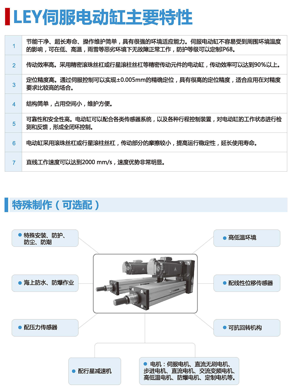 1.節(jié)能干凈、超長壽命、操作維護(hù)簡單,具有很強(qiáng)的環(huán)境適應(yīng)能力。伺服電動(dòng)缸不容易受到周圍環(huán)境溫度的影響,可在低、高溫,雨雪等惡劣環(huán)境下無故障正常工作,防護(hù)等級可以定制IP68。