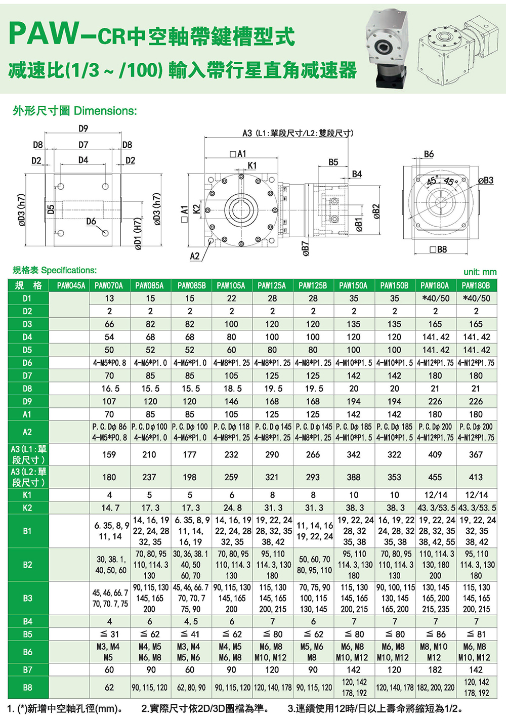 PAW-CR中空軸帶鍵槽型式 輸入帶行星直角減速器