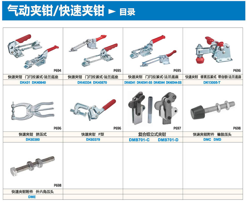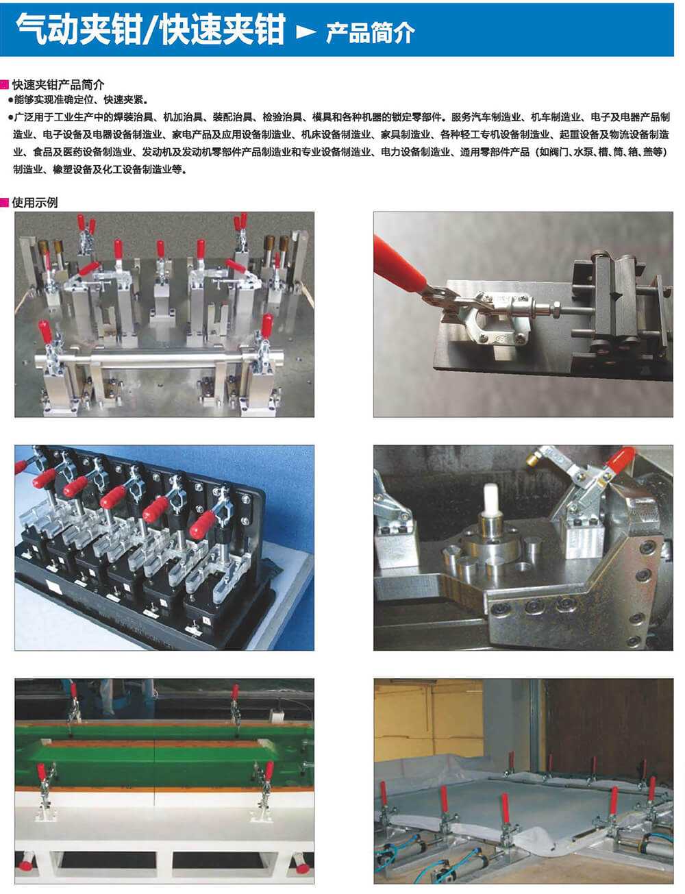 廣泛用于工業(yè)生產(chǎn)中的焊裝治具、機(jī)加治具、裝配治具、檢驗(yàn)治具、機(jī)具和各種機(jī)圈的鎖定零部件。服務(wù)汽車制造業(yè)、機(jī)車制造業(yè)、電子及電器產(chǎn)品制造業(yè)、電子設(shè)備及電器設(shè)備制造業(yè)、家電產(chǎn)品及應(yīng)用設(shè)備制造業(yè)、機(jī)床設(shè)備制造業(yè)、家具制造業(yè)、各種輕工專機(jī)設(shè)備制造業(yè)、起重設(shè)備及物流設(shè)備制造業(yè)、食品及醫(yī)藥設(shè)備制造業(yè)、發(fā)動(dòng)機(jī)及發(fā)動(dòng)機(jī)零部件產(chǎn)品制造業(yè)和專業(yè)設(shè)備制造業(yè)、電力設(shè)備制造業(yè)、通用零部件產(chǎn)品(如閥門、水泵、槽、簡、箱、蓋等)制造業(yè)、橡塑設(shè)備及化工設(shè)備制造業(yè)等。