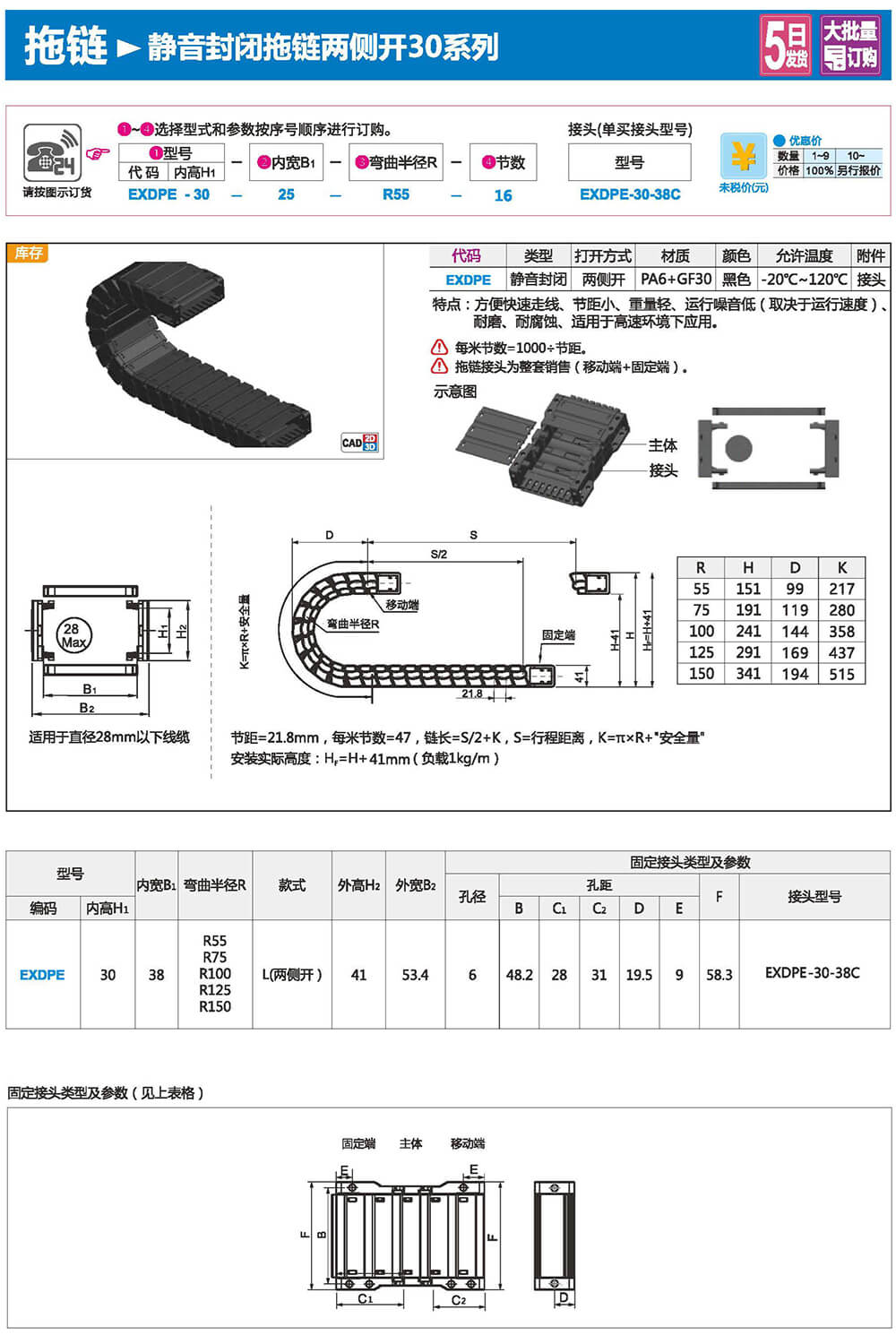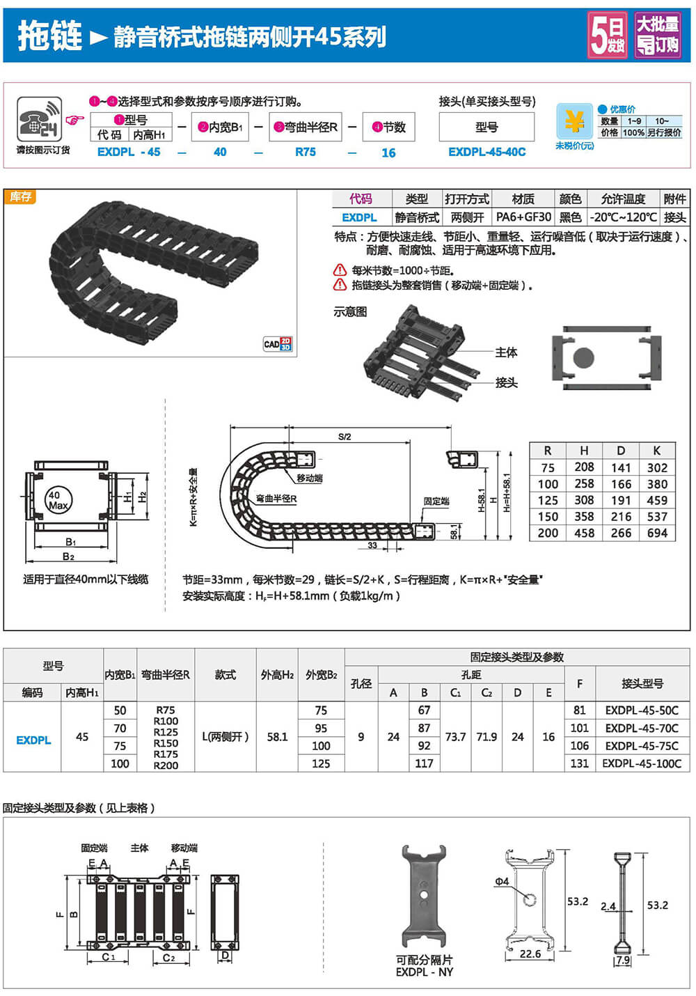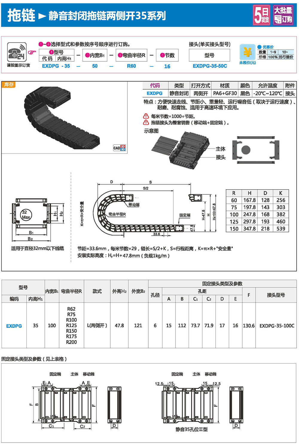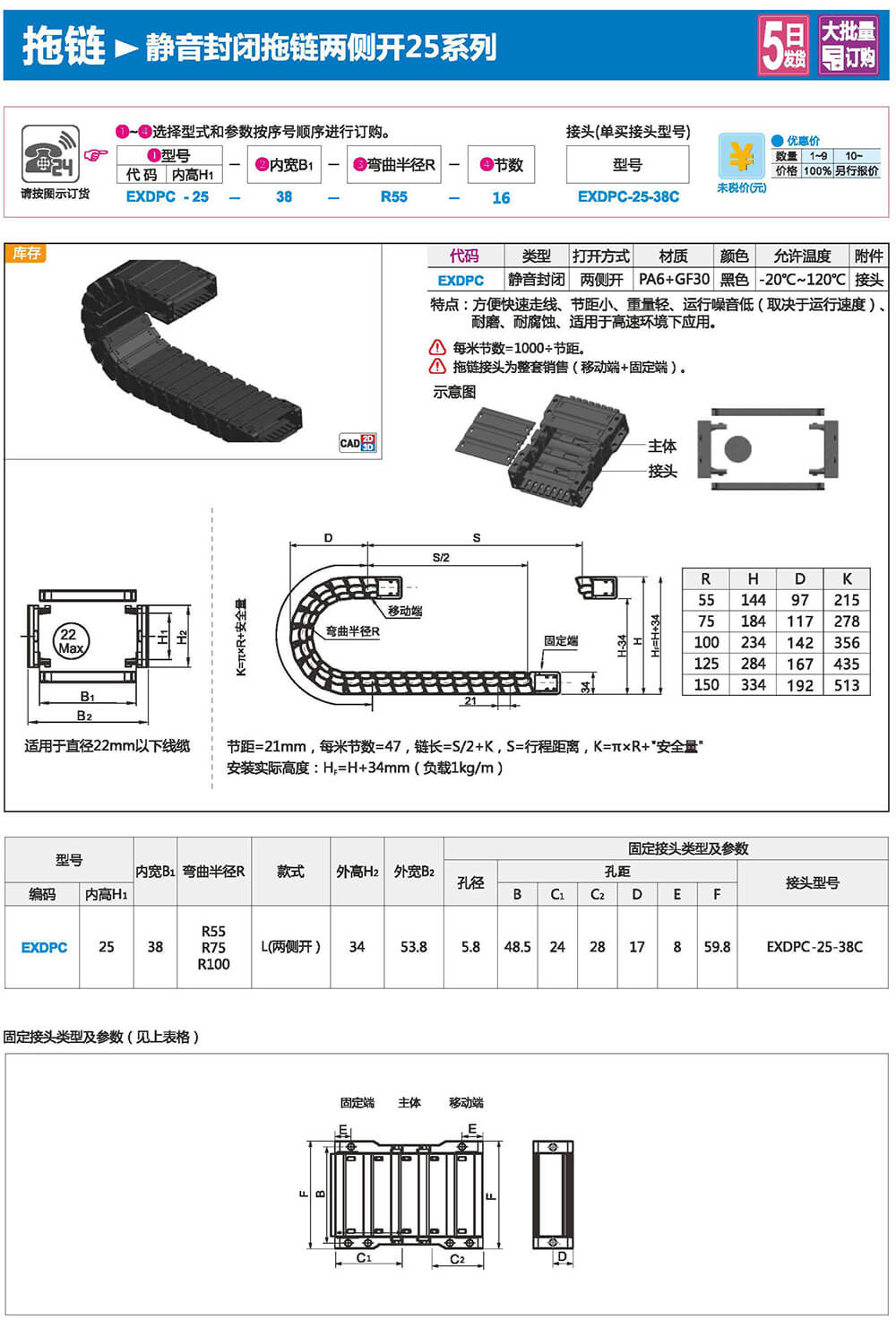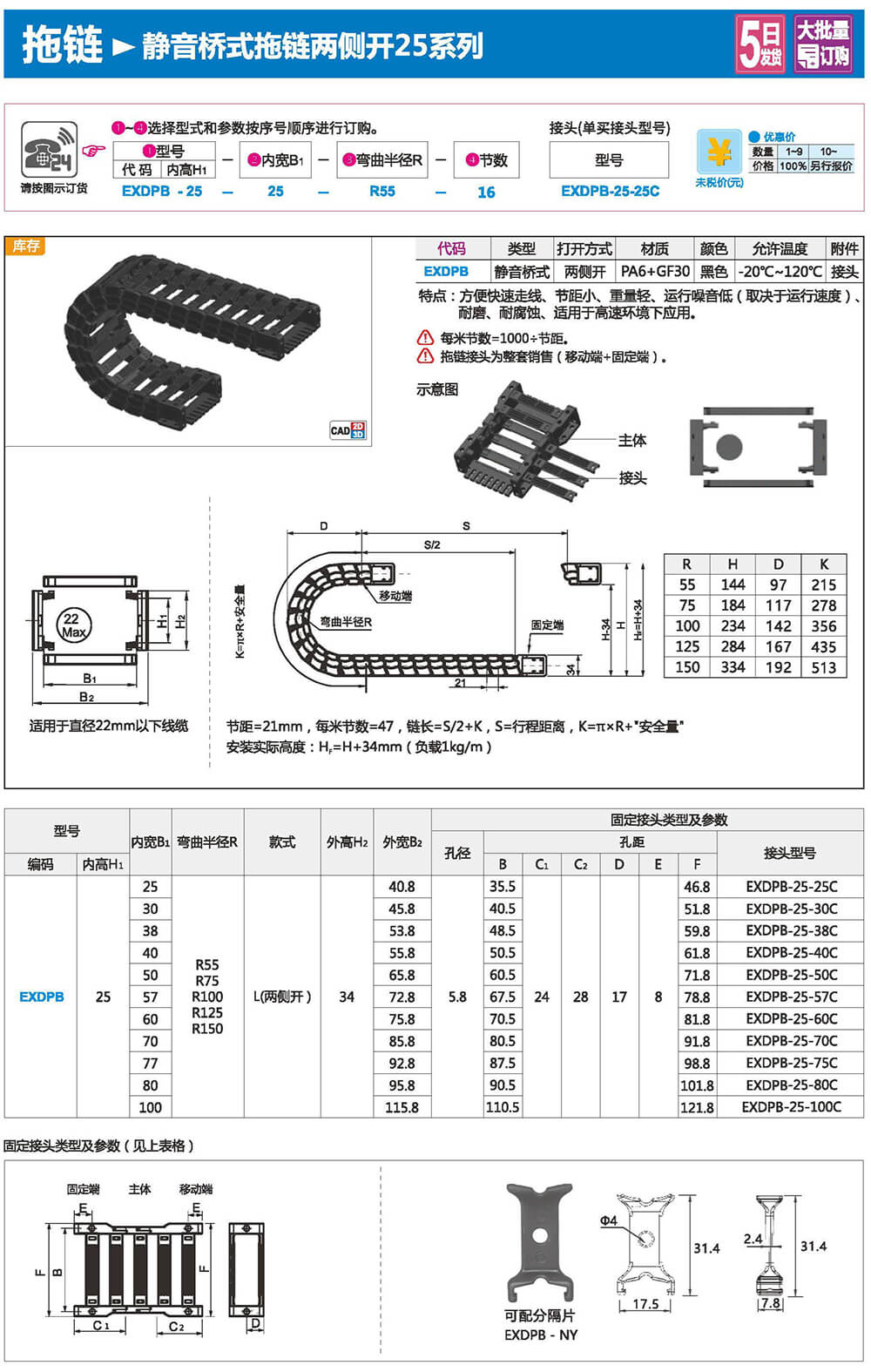 適合于使用在往復(fù)運(yùn)動(dòng)的場(chǎng)合,能夠?qū)?nèi)置的電纜、油管、氣管、水管等起到牽引和保護(hù)作用,拖鏈每節(jié)都能打開(kāi),便于安裝和維修。運(yùn)動(dòng)時(shí)噪音低、耐磨、可高速運(yùn)動(dòng)。拖鏈已被廣泛應(yīng)用于數(shù)控機(jī)床.電子設(shè)備、石材機(jī)械、玻璃機(jī)械、門(mén)窗機(jī)械、注塑機(jī)、機(jī)械手、起重運(yùn)輸設(shè)備、自動(dòng)化倉(cāng)庫(kù)等。