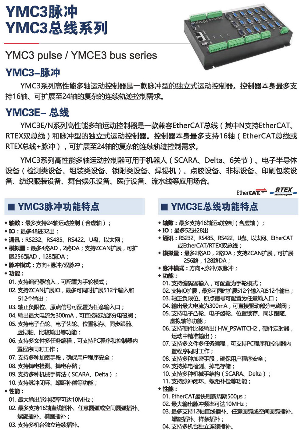YMC3E/N系列高性能多軸運(yùn)動(dòng)控制器是一款兼容EtherCAT總線 (其中N支持EtherCAT.RTEX雙總線)和脈沖型的獨(dú)立式運(yùn)動(dòng)控制器。控制器本身最多支持16軸( EtherCAT總線或RTEX總線+脈沖) , 可擴(kuò)展至24軸的復(fù)雜的連續(xù)軌跡控制需求。