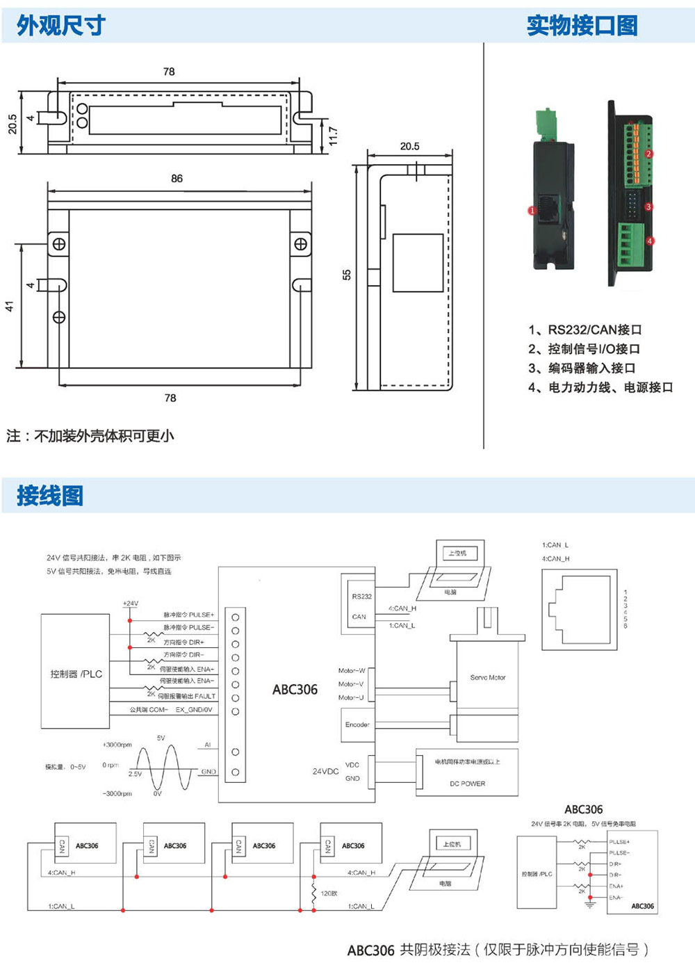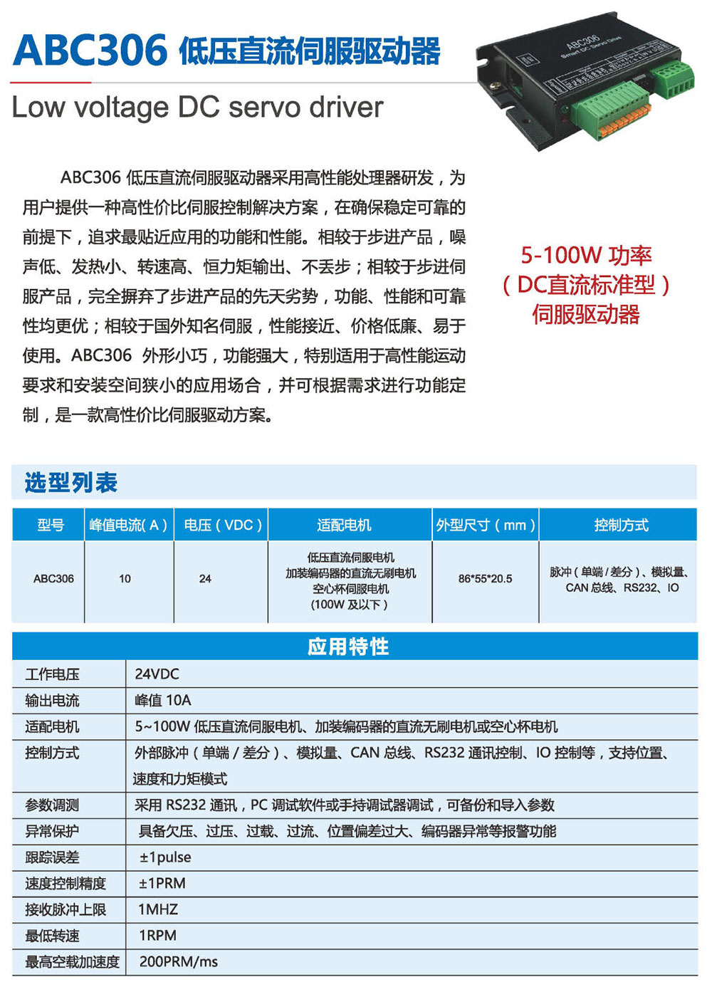 ABC306低壓直流伺服驅(qū)動(dòng)器采用高性能處理器研發(fā),為 用戶提供一種高性價(jià)比伺服控制解決方案,在確保穩(wěn)定可靠的 前提下,追求貼近應(yīng)用的功能和性能。相較于步進(jìn)產(chǎn)品,噪 聲低、發(fā)熱小、轉(zhuǎn)速高、恒力矩輸出、不丟步;相較于步進(jìn)伺 服產(chǎn)品,摒棄了步進(jìn)產(chǎn)品的先天劣勢(shì),功能、性能和可靠 性均更優(yōu);相較于國(guó)外知名伺服,性能接近、價(jià)格低廉、易于 使用。ABC306外形小巧,功能強(qiáng)大,特別適用于高性能運(yùn)動(dòng) 要求和安裝空間狹小的應(yīng)用場(chǎng)合,并可根據(jù)需求進(jìn)行功能定 制,是一款高性價(jià)比伺服驅(qū)動(dòng)方案。
